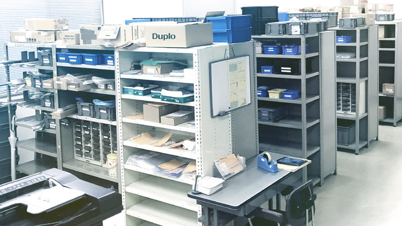 本社および全国の各拠点に修理用部品を常時ストックし、万が一のトラブルにも迅速に対応できる体制を整えています。在庫する部品は、過去のメンテナンス履歴をもとに分析を行い、実際の使用傾向に応じて選定。現場で求められるものを確実にそろえることで、対応スピードと修理精度の向上につなげています。